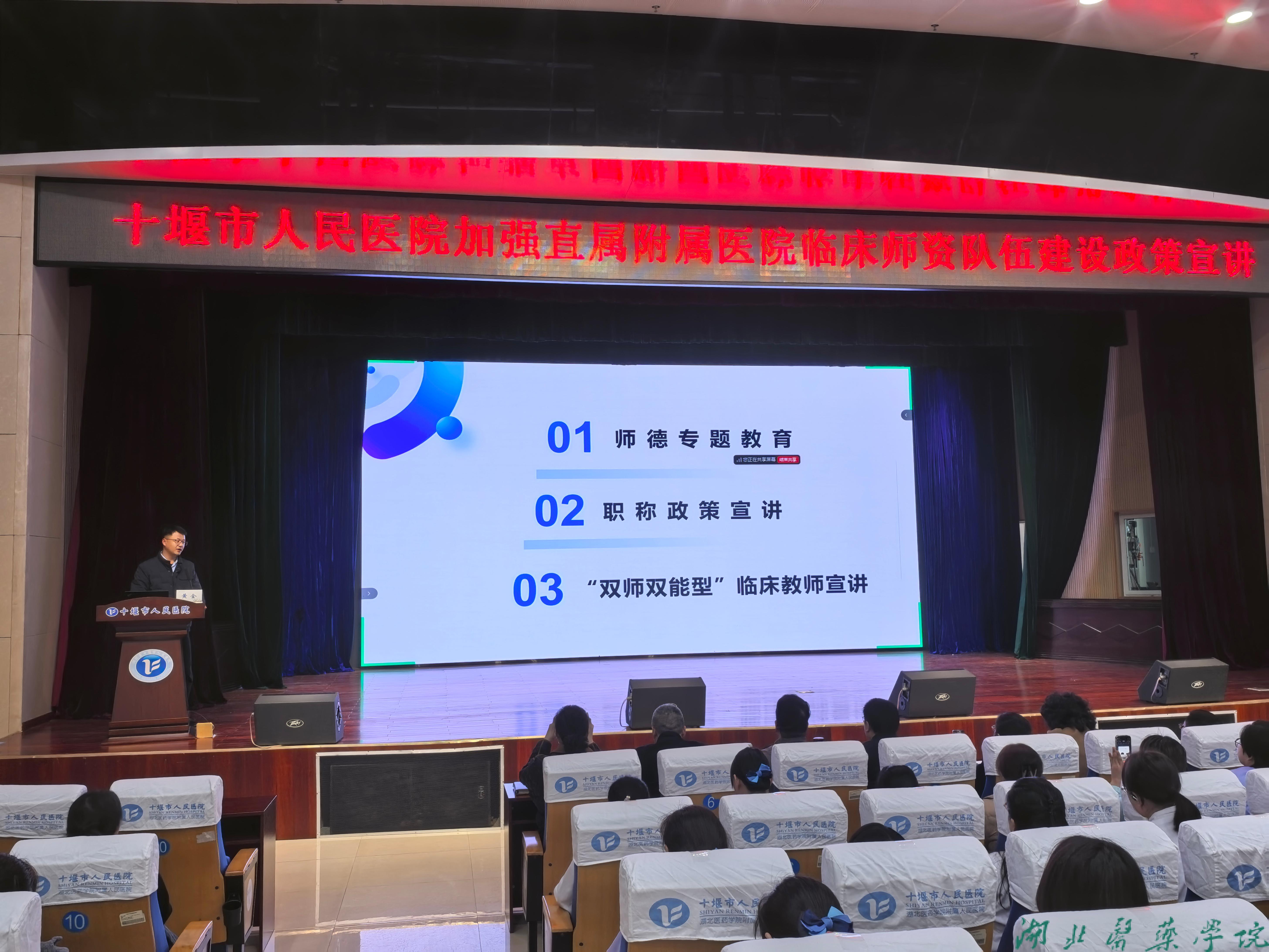 本网讯(通讯员陈久丽)为深化医教协同发展,推进高素质临床教师队伍建设,3月6日下午,第三临床学院特邀校人事处副处长黄金赴直属附属人民医院开展师德师风及人事政策专题宣讲会。第三临床学院及附属人民医院全体在家院领导、副护士长以上干部及非值班党员等近300人参会。