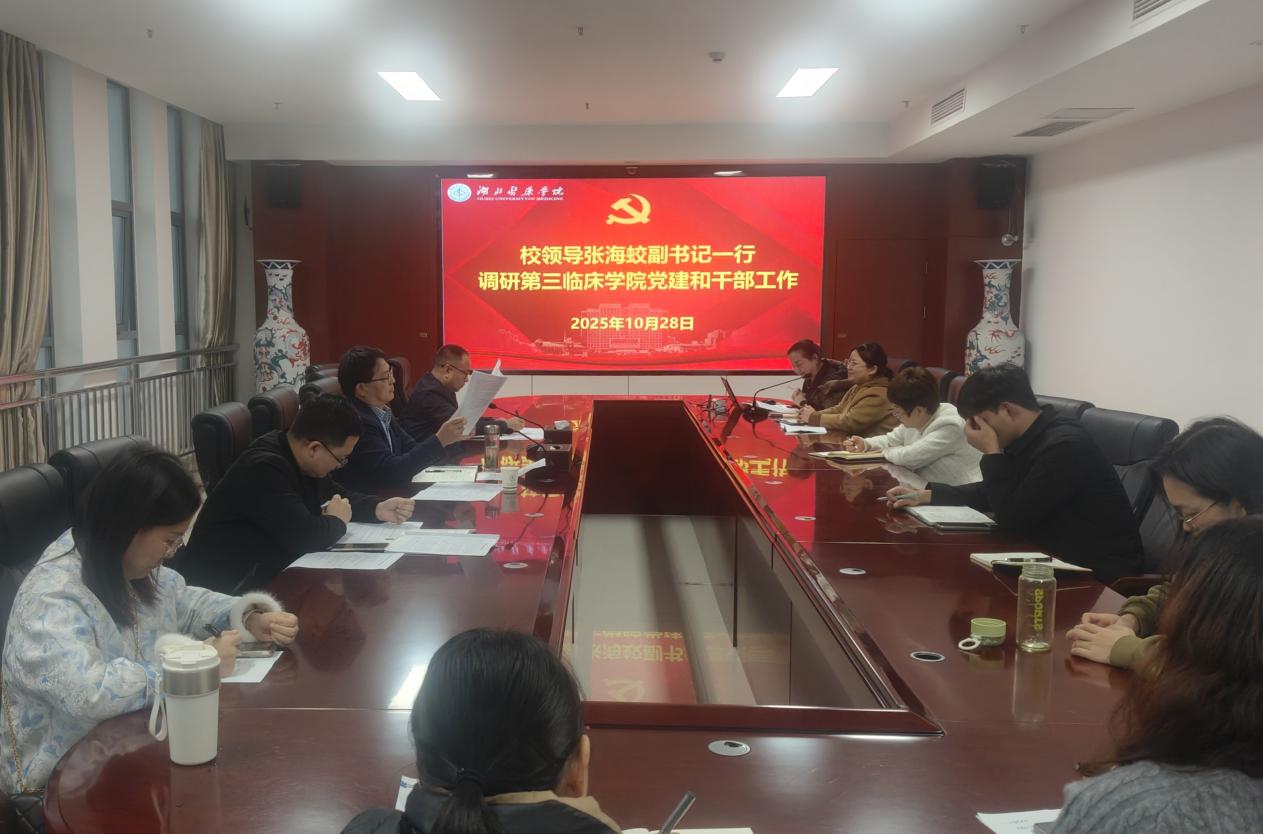 本网讯(通讯员 陈骊嘉)10月28日下午,校党委副书记、组织部部长张海蛟带领党委统战部副部长林宝虎、校党委组织部组织科科长赵峥一行在科教楼1708会议室对第三临床学院的党建和干部工作进行调研。第三临床学院班子成员代表、党建组织员及各职能部门负责人、党支部书记及全体学工干部参会。