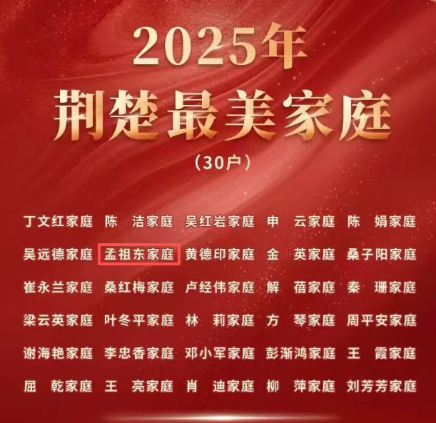 据悉,今年5月起,湖北省启动“荆楚最美家庭”宣传选树活动,旨在建设好家庭、涵养好家教、传承好家风的家庭文明新风尚,为湖北“奋勇争先、建成支点、谱写新篇”凝聚家庭力量。经层层发动、推荐、审核与公示,全省共30户家庭脱颖而出,孟祖东家庭位列其中。